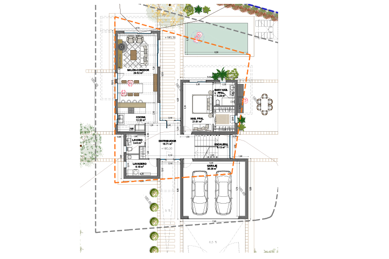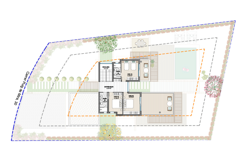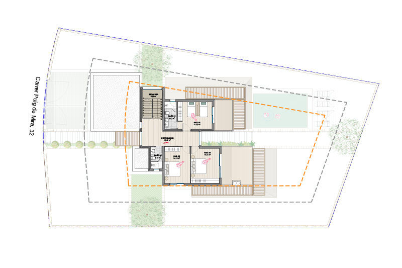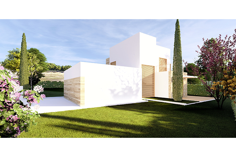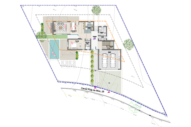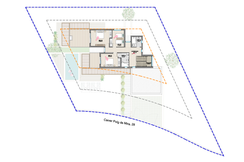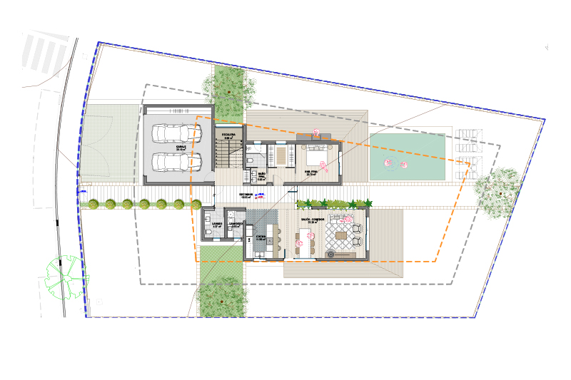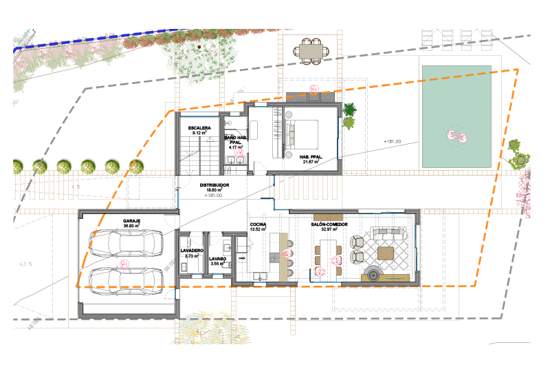Las 5 viviendas de la fase 2 se organizan por zonas funcionales (uso de día / noche / aparcamiento doble) con un eje central de composición, que corresponde con el eje longitudinal de la parcela y con la dirección de las vistas hacia el jardín y la piscina.