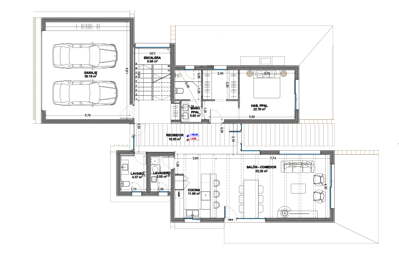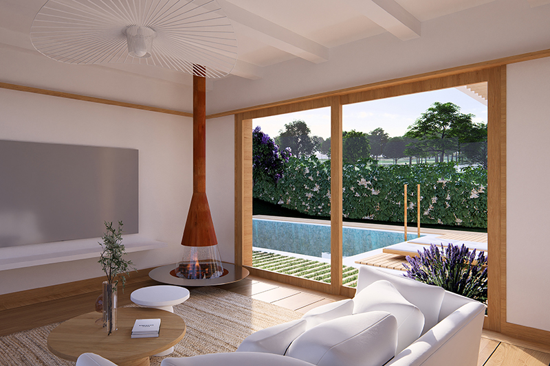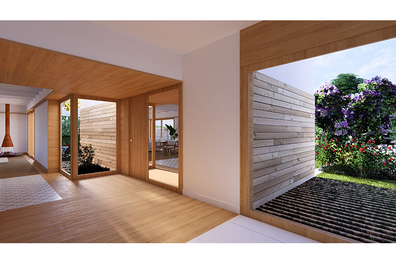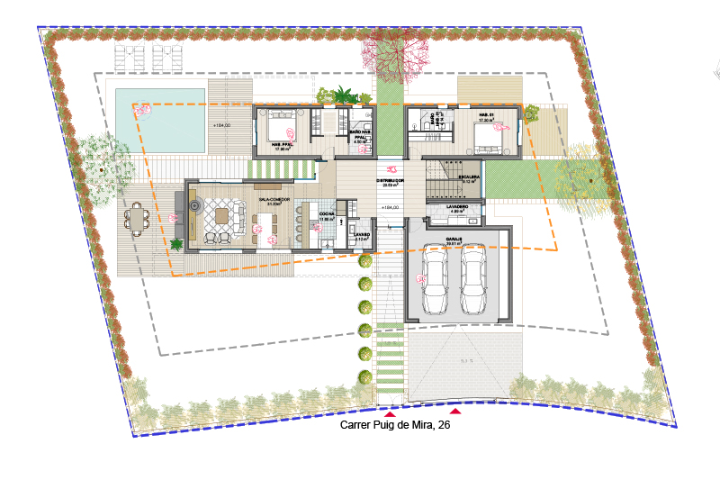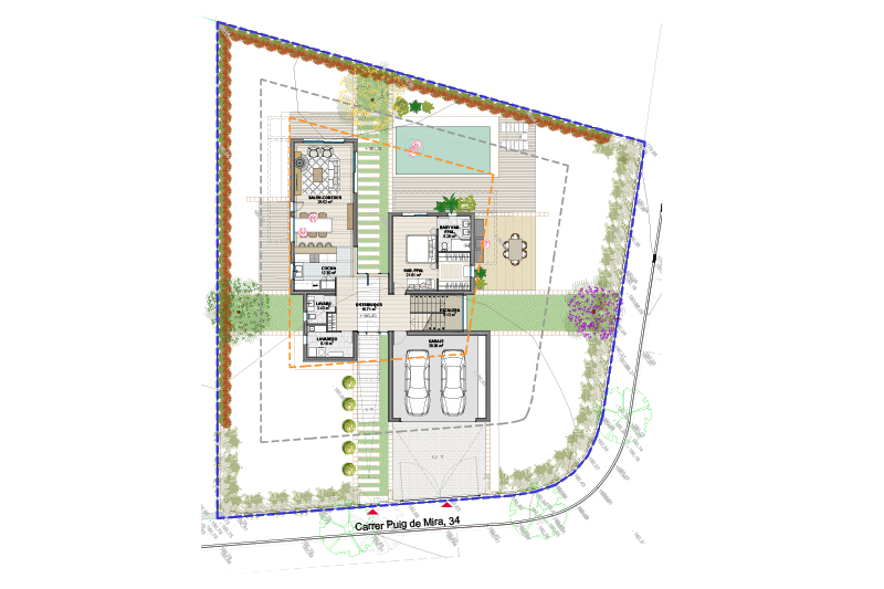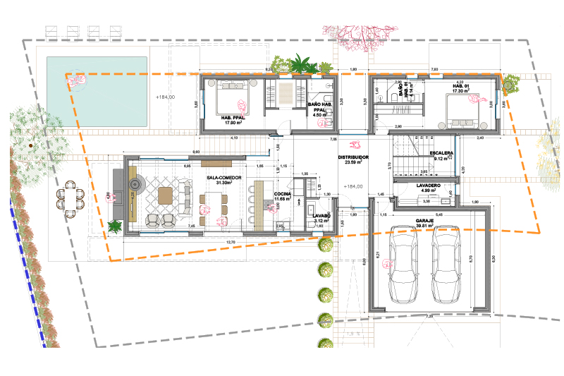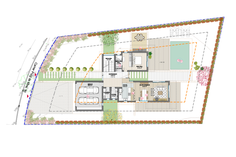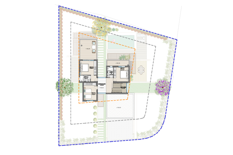 Las 5 viviendas de la fase 2 se organizan por zonas funcionales (uso de día / noche / aparcamiento doble) con un eje central de composición, que corresponde con el eje longitudinal de la parcela y con la dirección de las vistas hacia el jardín y la piscina.