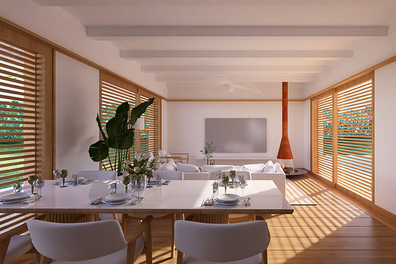 Como criterio estético, se ha buscado conseguir el efecto “Wow” en la entrada, mediante un espacio recibidor – distribuidor que conecta todas las zonas funcionales y al mismo tiempo tiene un gran ventanal / balconera justo delante de la puerta de acceso, que nos permite ver el jardín a través de toda la planta baja.