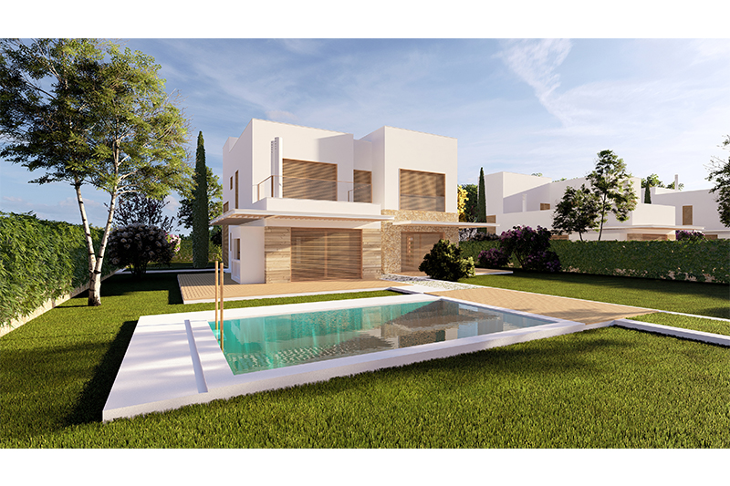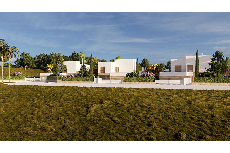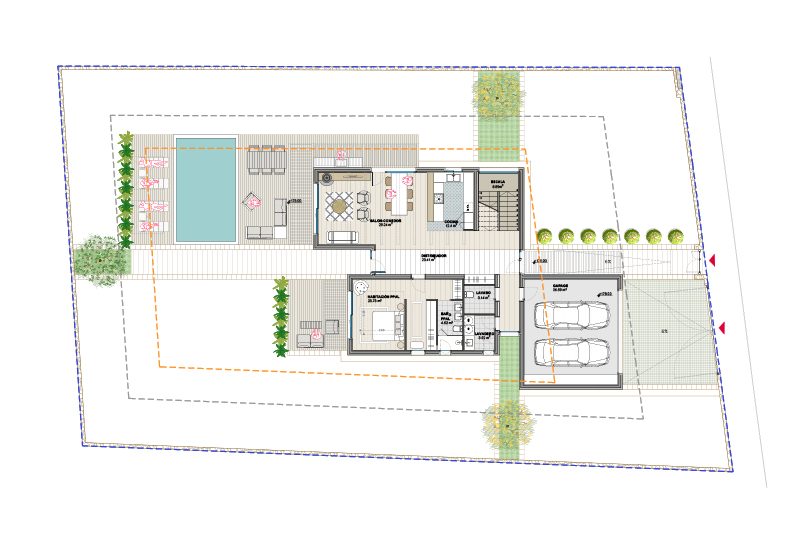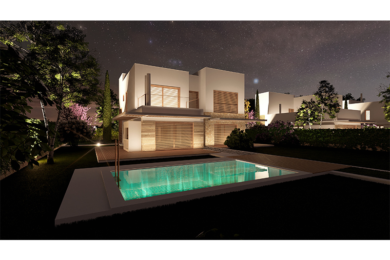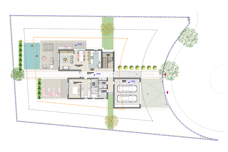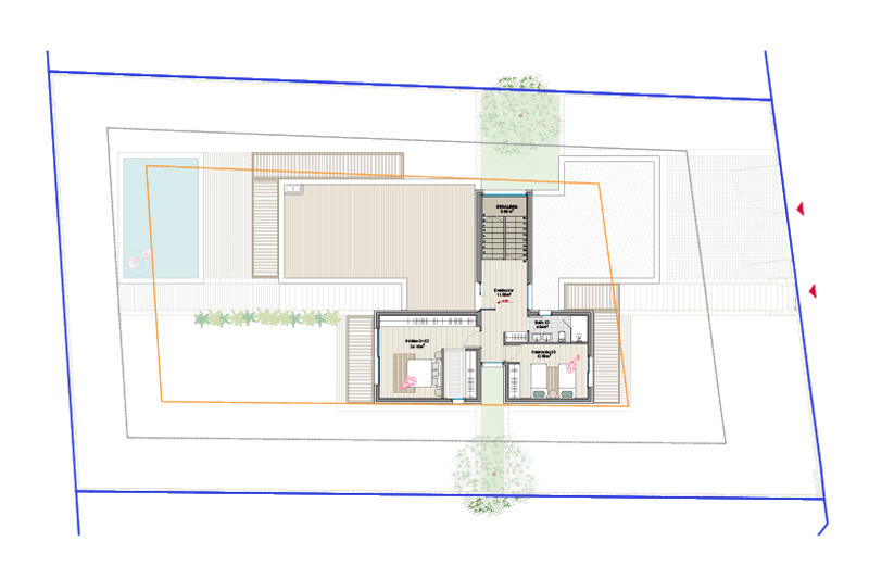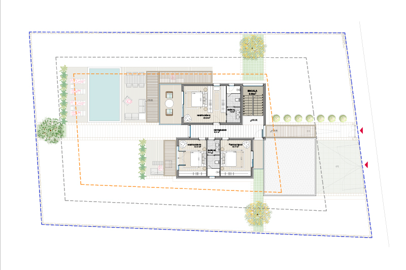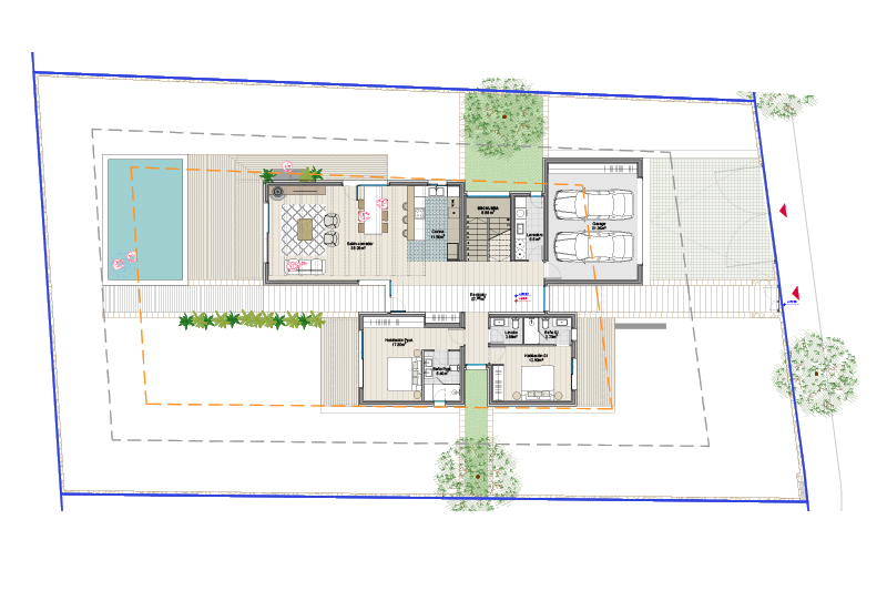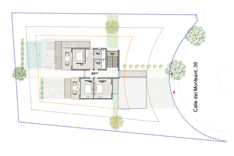 Las 3 viviendas de la fase 3 se organizan por zonas funcionales (uso de día / noche / aparcamiento doble) con un eje central de composición, que corresponde con el eje longitudinal de la parcela y con la dirección de las vistas hacia el jardín y la piscina.