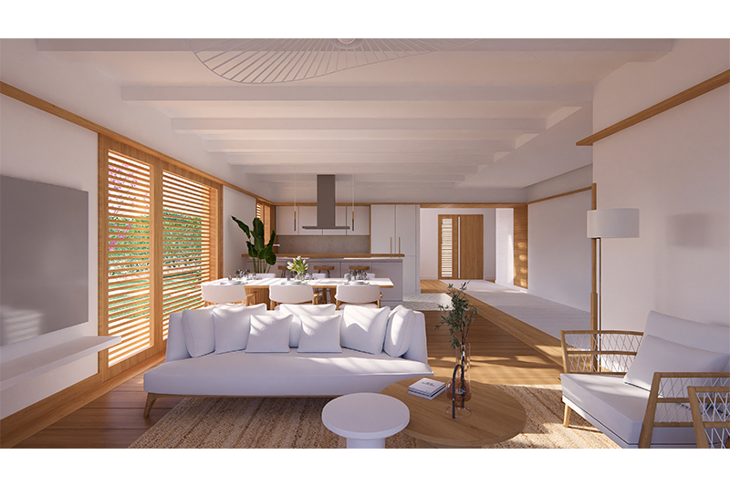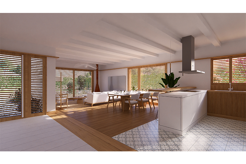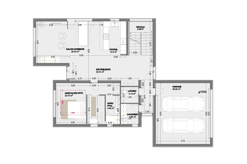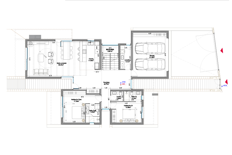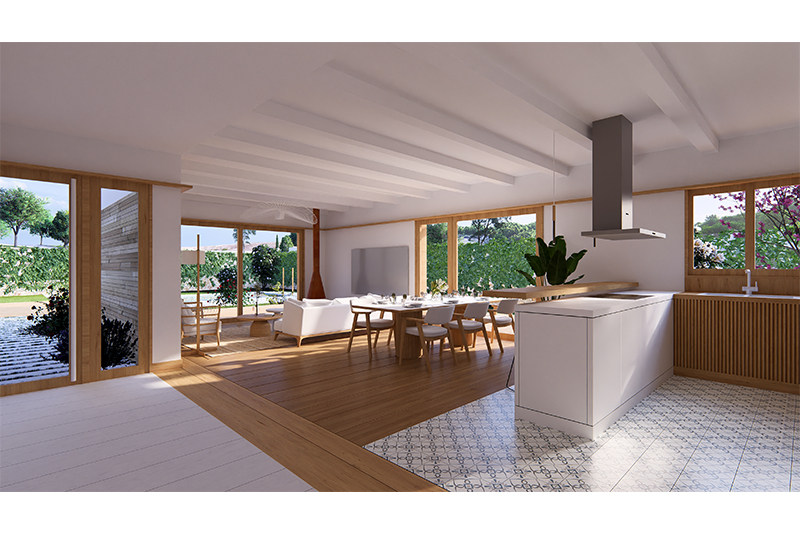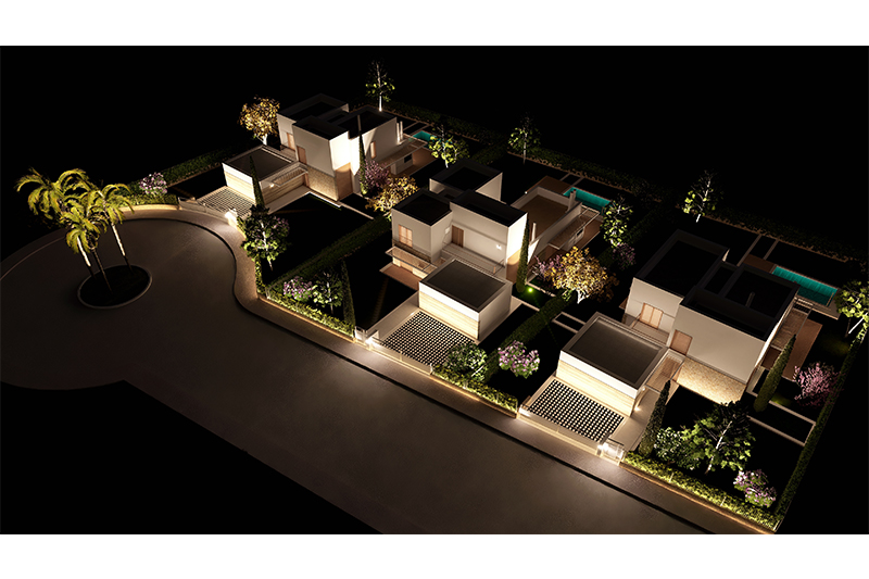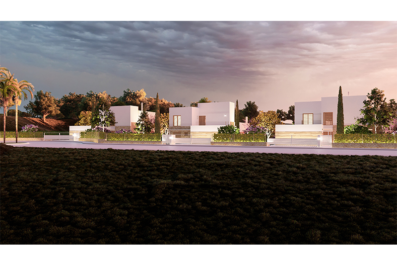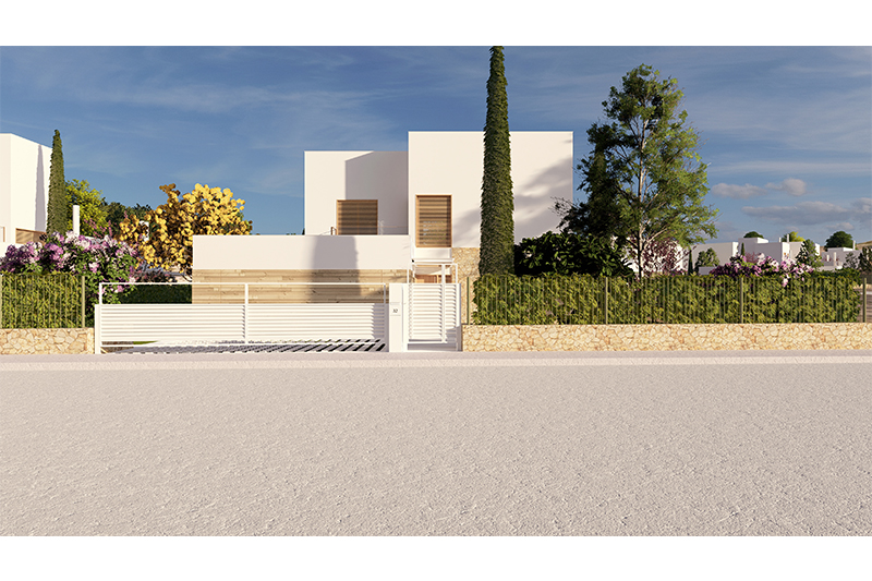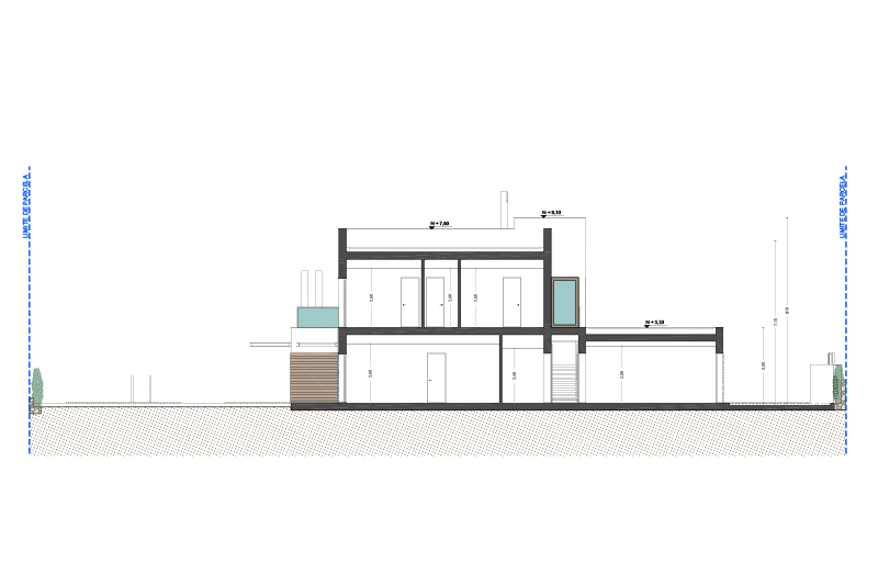 Las 3 viviendas de la fase 3 se organizan por zonas funcionales (uso de día / noche / aparcamiento doble) con un eje central de composición, que corresponde con el eje longitudinal de la parcela y con la dirección de las vistas hacia el jardín y la piscina.