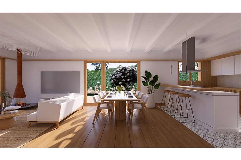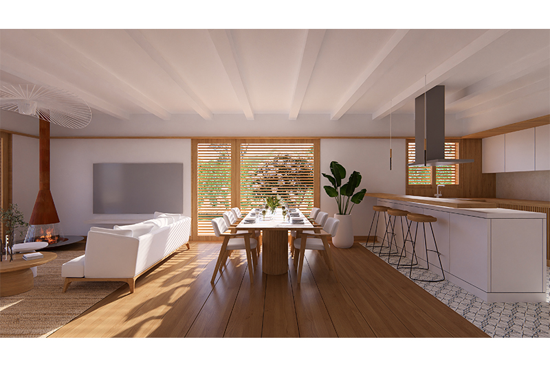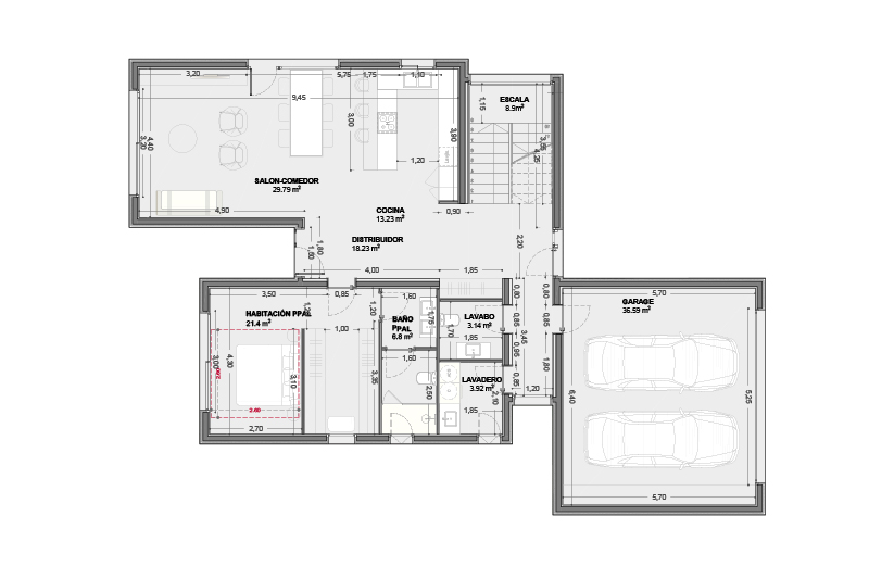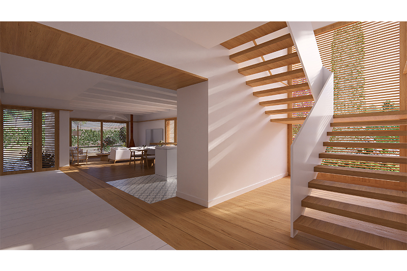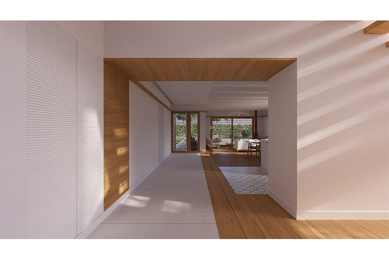 Como criterio estético, se ha buscado conseguir el efecto “Wow” en la entrada, mediante un espacio recibidor – distribuidor que conecta todas las zonas funcionales y al mismo tiempo tiene un gran ventanal / balconera justo delante de la puerta de acceso, que nos permite ver el jardín a través de toda la planta baja.