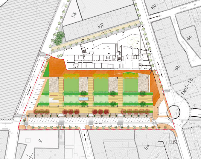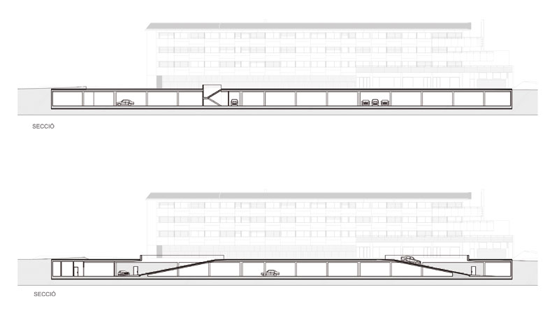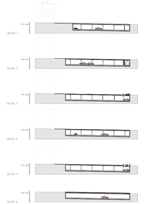 L'edifici es planteja com una peça soterrada, deixant la coberta impermeabilitzada i a punt per a la urbanització de la plaça, ocupant el subsòl en la part esmentada anteriorment.