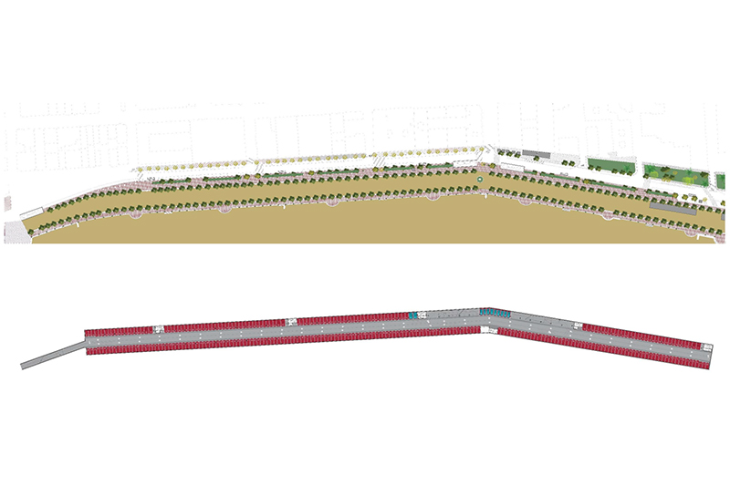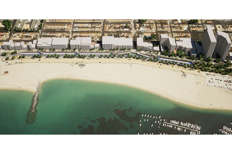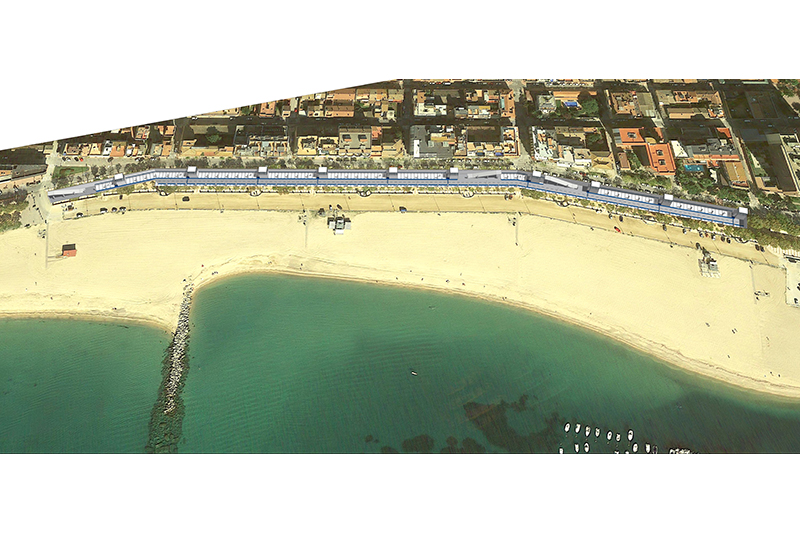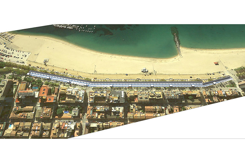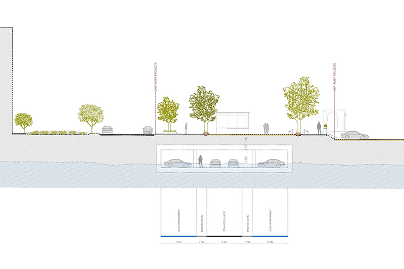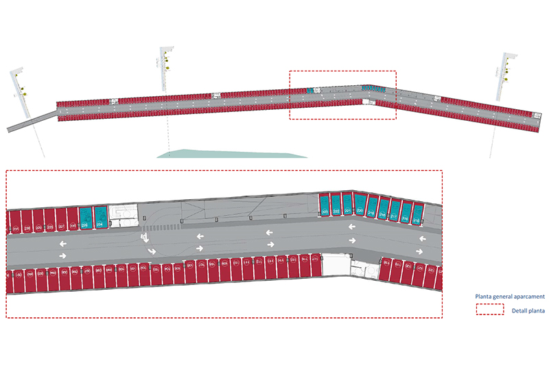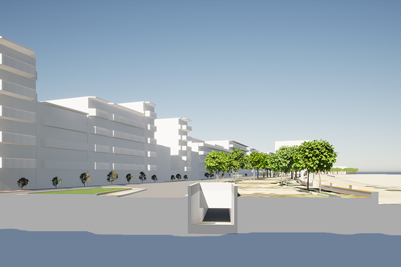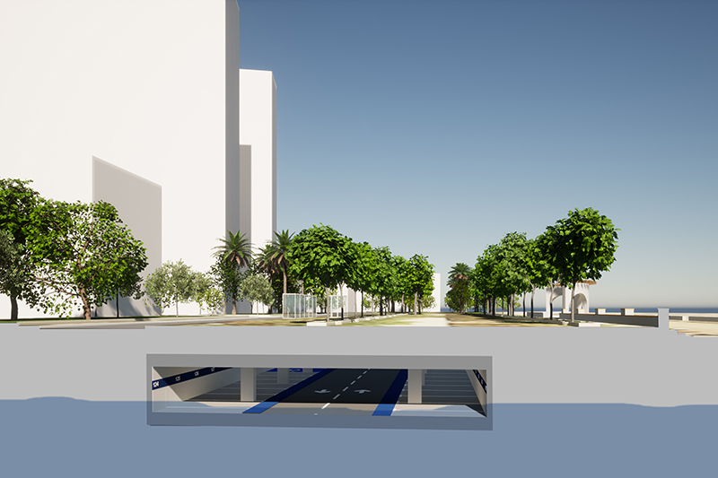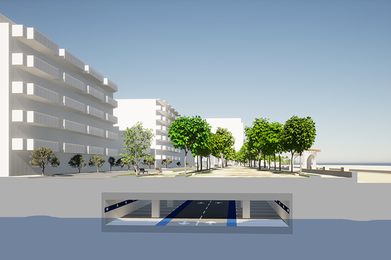 La solució estudiada és d’un sol soterrani, nau única amb carril central d’anada i tornada amb una amplada controlada, per evitar afectar els edificis del front marítim, el col·lector d’impulsió i el mur de la platja.