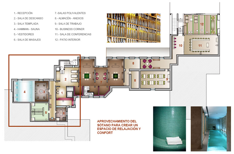 Al soterrani de l'edifici principal, existeixen dos espais destinats a bodega així com quatre zones de trobada i reunió on es pot organitzar activitats de cata o construir tranquils llocs de lectura i tertúlia.