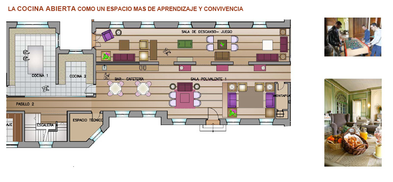 A més a més de la zona destinada a bar-cafeteria, situat entre la cuina i la sala polivalent, la proposta contempla l'existència de 2 menjadors, el principal i de grup.