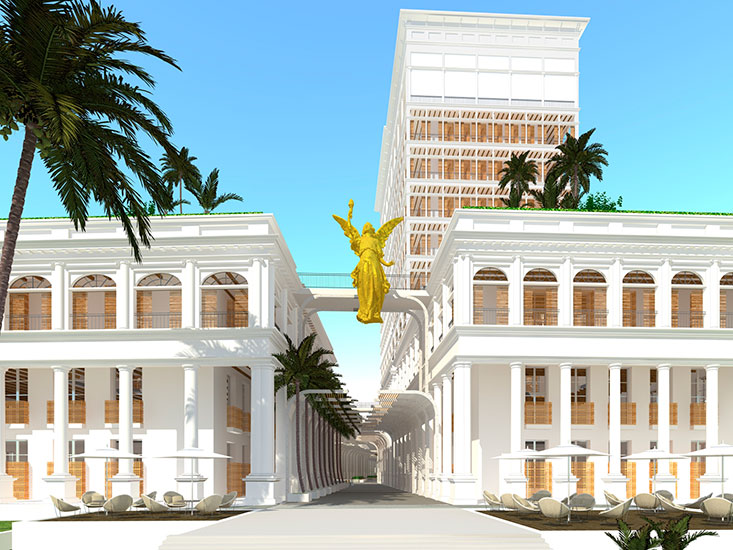 El projecte preliminar està compost per un gran centre de convencions i centre comercial que se situa en el sòcol de l'edifici i les següents tres plantes. D'aquest volúmen neixen unes torres que es divideixen en dos hotels d'alta categoria amb un total de 700 habitacions. Les torres es coronen amb unes "infinity pools" amb vistes panoràmiques a la ciutat i al mar caribe.