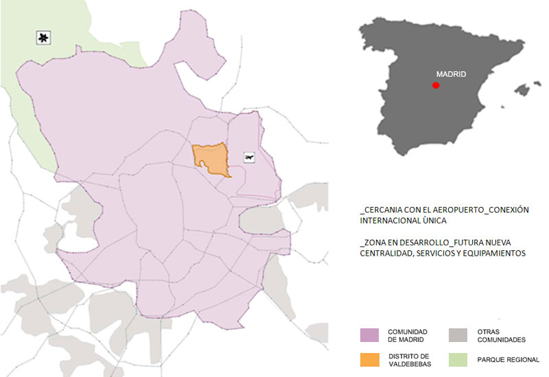 El projecte es troba a Valdebebas, Madrid, a un pas de l'aeroport de Barajas on hem conceptualitzat i formalitzat un masterplan.