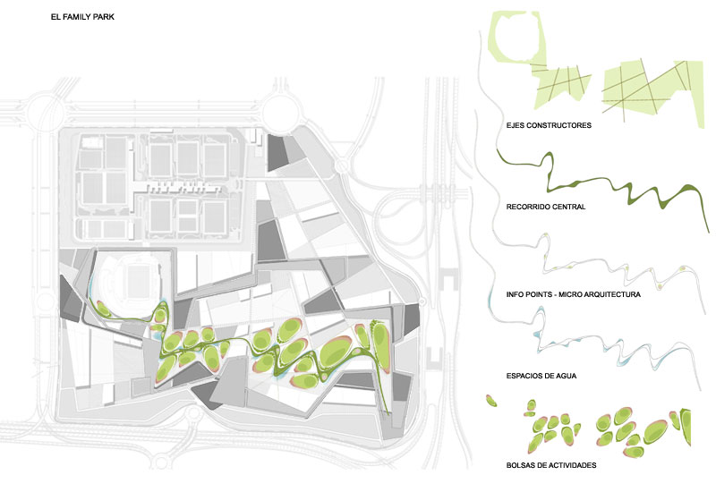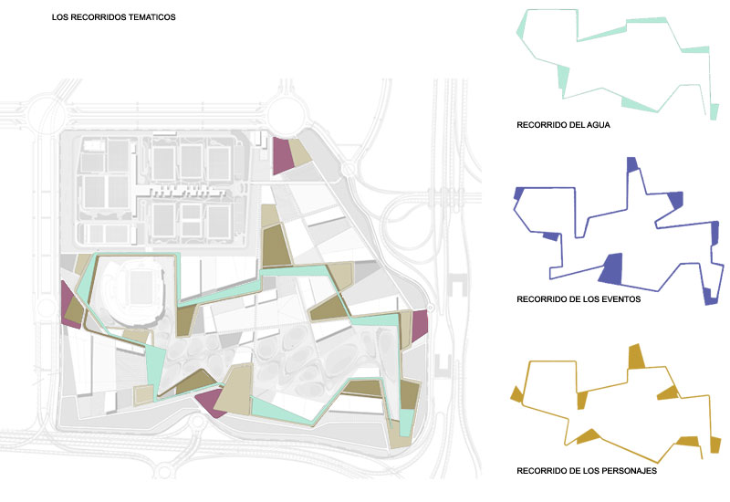 Els recorreguts es mouen entre àrees hoteleres, de retail, una universitat de l'esport, etc. i el centre neuràlgic és l'àgora. Hi ha 4 accessos principals amb 4 places d'accés i zones d'aparcaments - parcs adossats als límits. En el centre s'estructura el family park, un element lúdic alternatiu, que funciona en paral·lel als recorreguts i completa la proposta.