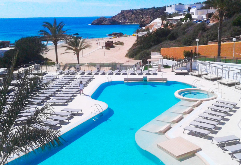 La piscina, de formes orgàniques, se situa dins d'una terrassa envoltada de bars i restaurants tipus Lounge, adaptada per gaudir del lloc i del paisatge.