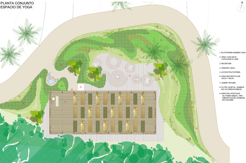 La proposta tracta del disseny d'una plataforma per a la pràctica de Ioga dins d'un complex turístic hoteler de 5 estrelles.