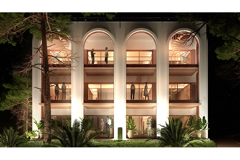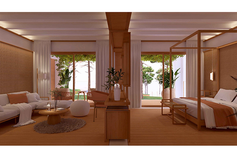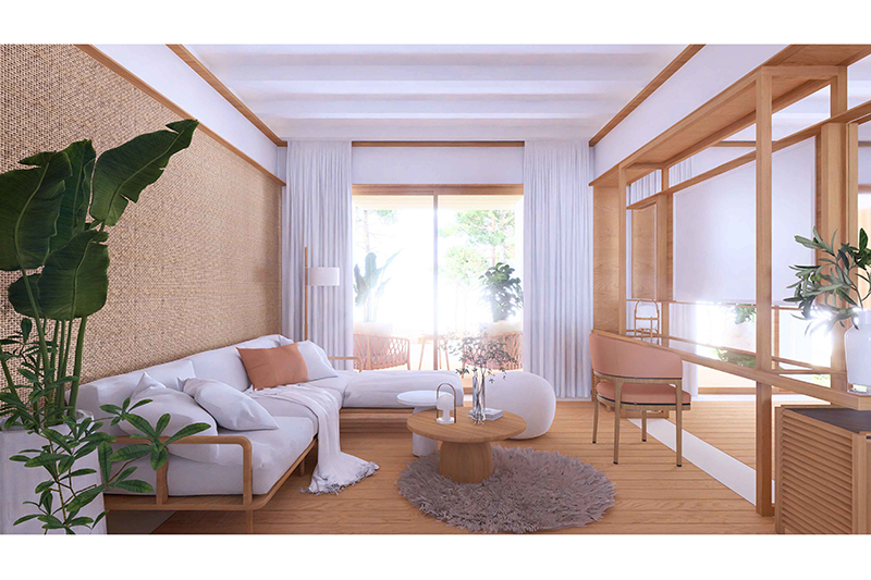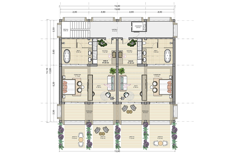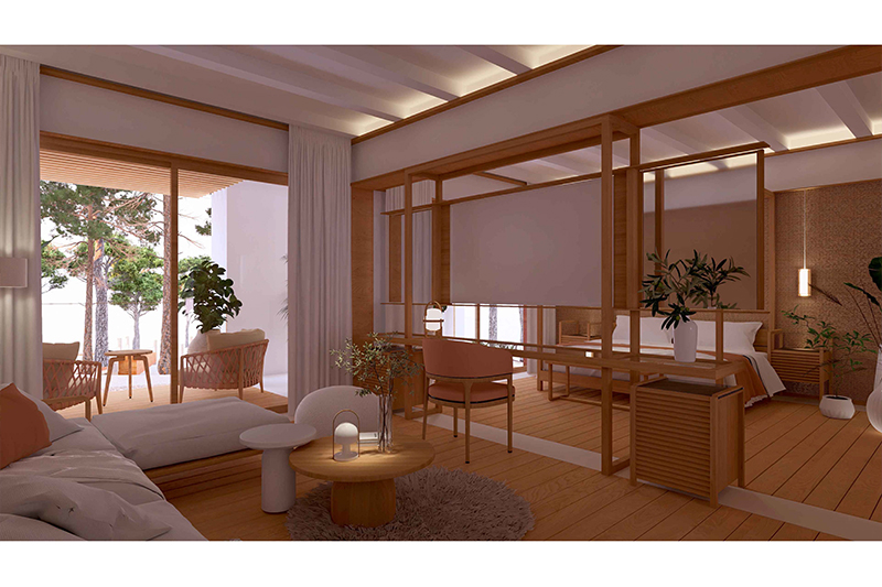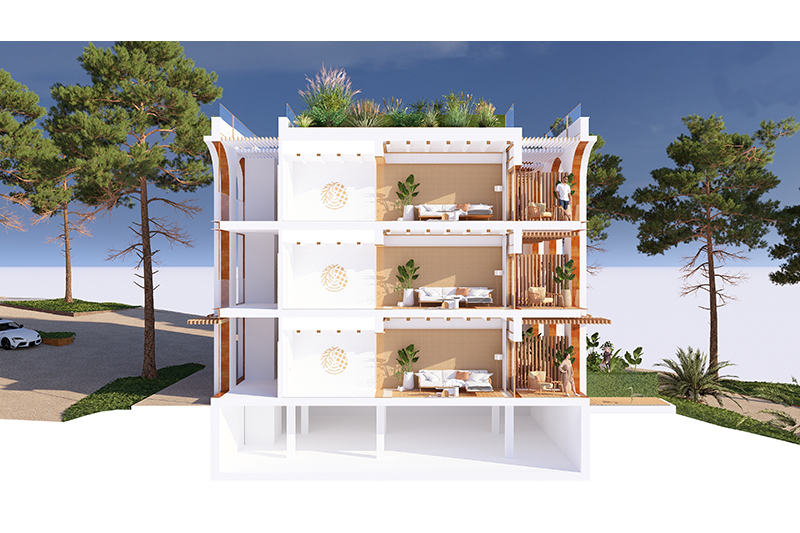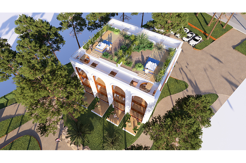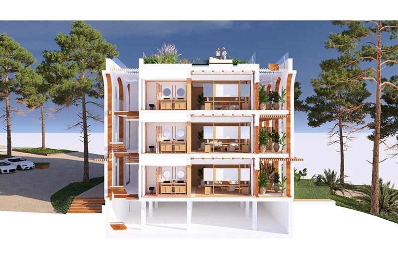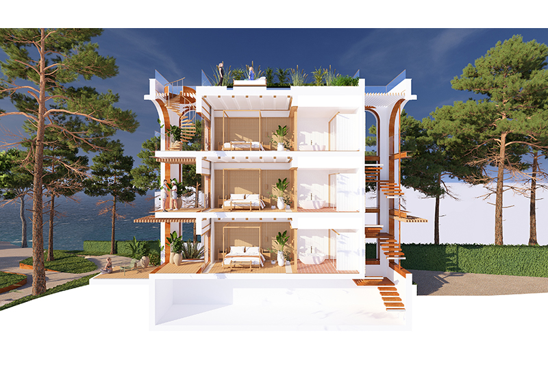 Cada planta conté 2 suites idèntiques (simètriques), amb zona de dia i de nit, vestíbul, bany i balcó/terrassa mirant el mar. Les 6 habitacions tenen la mateixa orientació (obrint-se cap al sud, amb vistes al mar) i particularitats o petites diferències per la planta on es troben: les de planta baixa tenen sortida directa al jardí, des de les respectives terrasses, i les de la planta superior tenen accés a la coberta de l’edifici, amb una zona de solàrium o chill-out privat.