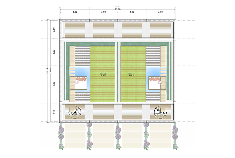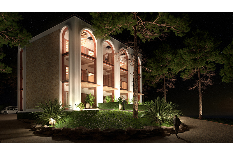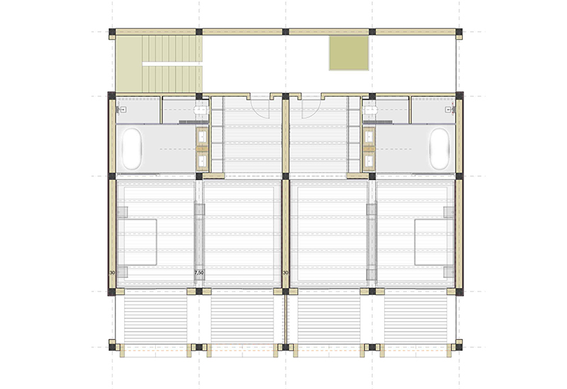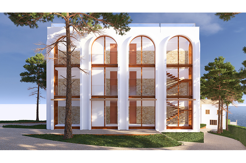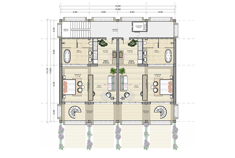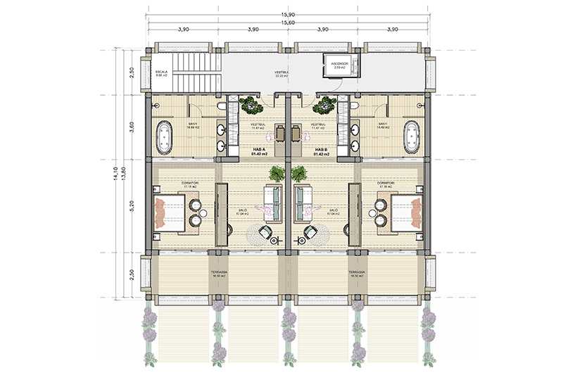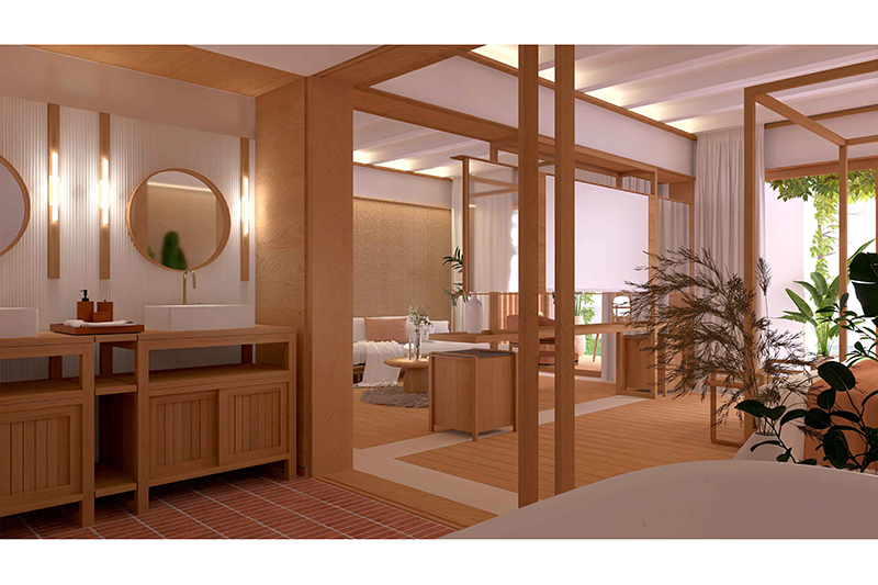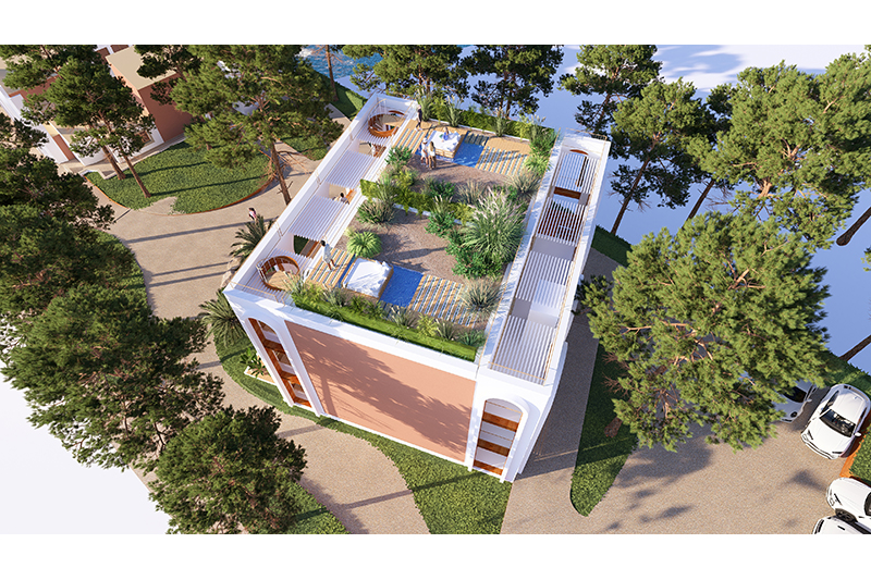 Cada planta conté 2 suites idèntiques (simètriques), amb zona de dia i de nit, vestíbul, bany i balcó/terrassa mirant el mar. Les 6 habitacions tenen la mateixa orientació (obrint-se cap al sud, amb vistes al mar) i particularitats o petites diferències per la planta on es troben: les de planta baixa tenen sortida directa al jardí, des de les respectives terrasses, i les de la planta superior tenen accés a la coberta de l’edifici, amb una zona de solàrium o chill-out privat.