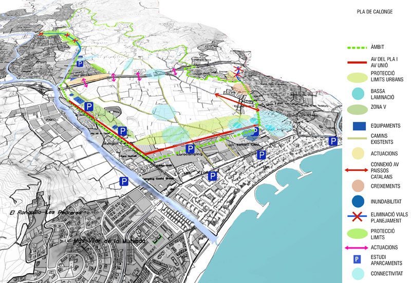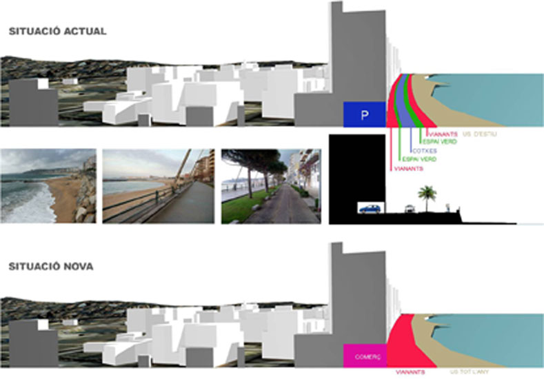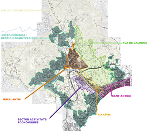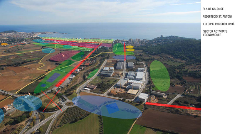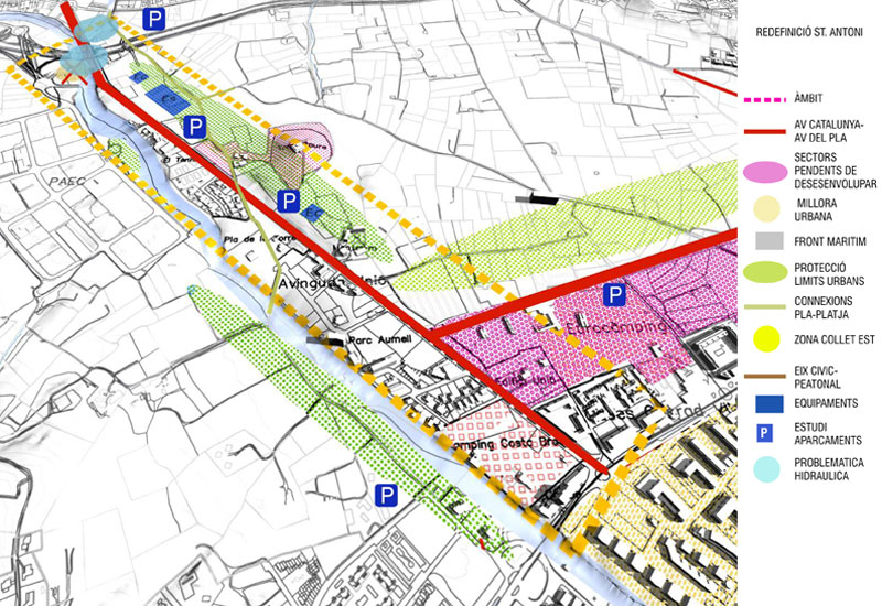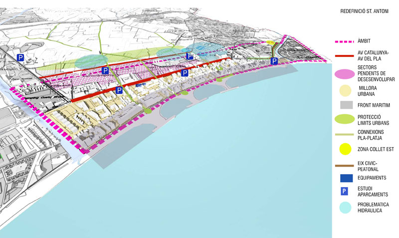 _El front de mar i Sant Antoni. Augmentar el comerç al front marítim de Sant Antoni. Transformar l' Av. Catalunya en eix comercial urbà de transito lent. Potenciar el fluix "vertical" Pla-mar i traslladar el fluix de transit ràpid al Carrer Mascarell. Re definir la urbanització i edificació de la zona urbana entre Av. Catalunya i el Pla com a zona d'expansió del nucli urbà i de protecció del Pla al mateix temps.