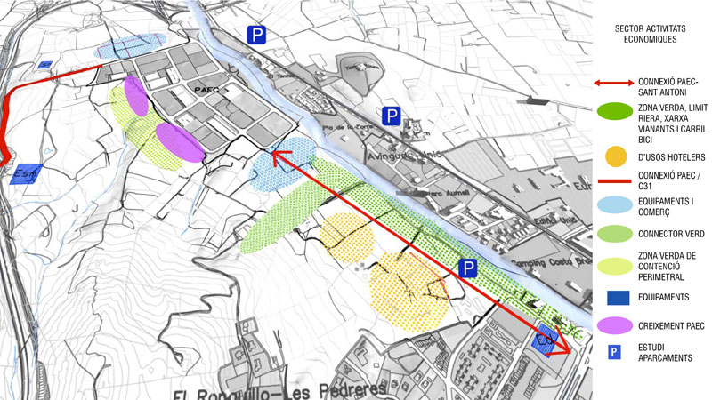 _Àrees de desenvolupament econòmic. Lleuger creixement amb comerços i equipaments. Proposta de connexió directa a la C 31. Al sud preservació de la zona verda al costat de la riera protecció del patrimoni agrícola i nova zona hotelera de qualitat.