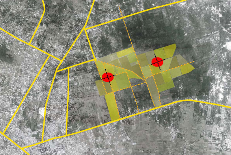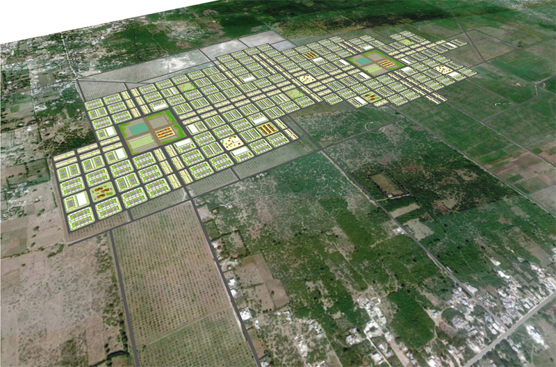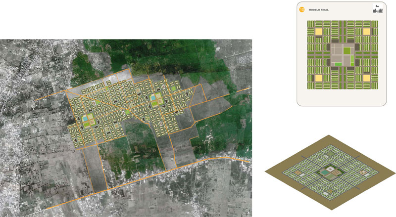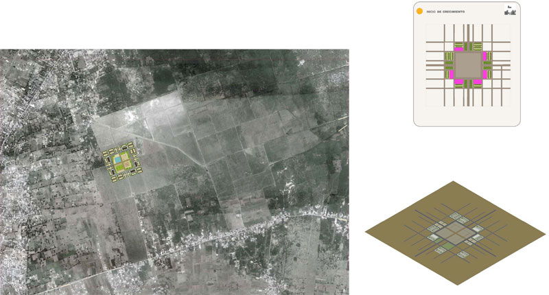 Primer la nostra intenció va ser donar unes pautes per crear un model de comunitat que es pugui adaptar a qualsevol entorn, a més de ser fàcilment extensible. Vam donar uns eixos de referència per al creixement que es poden adaptar al terreny i al clima del lloc d'emplaçament i en el seu encreuament vam posar la plaça central amb edificis d'administració i equipaments. Vam Crear un sistema de vialitat jeràrquic i un tipus d'illes diferents segons el sistema topològic que varia segons el nucli familiar, atents a deixar en tots els casos unes zones d'horts.