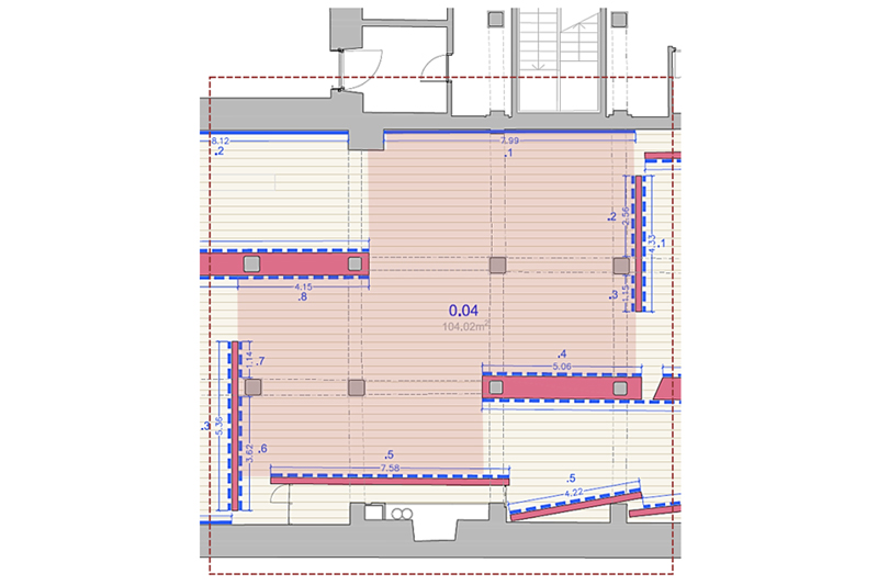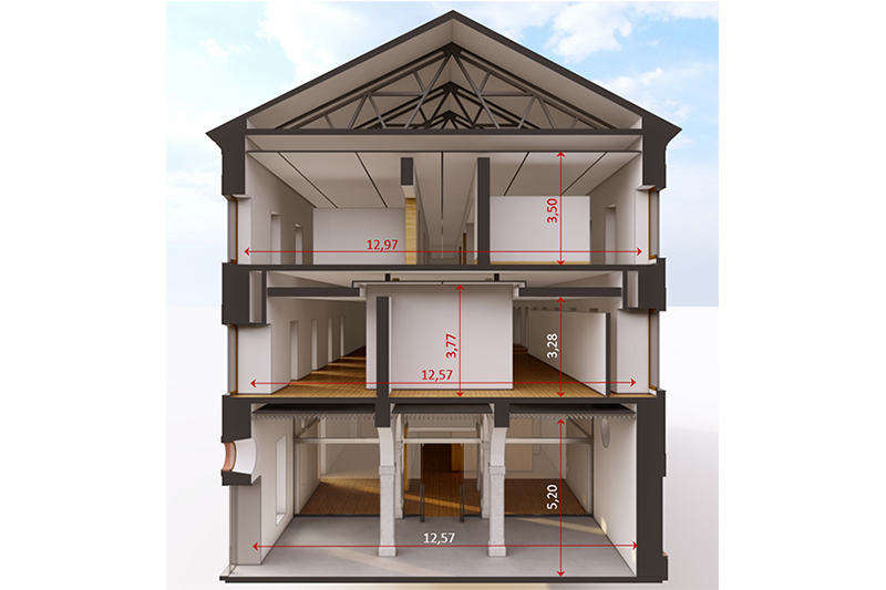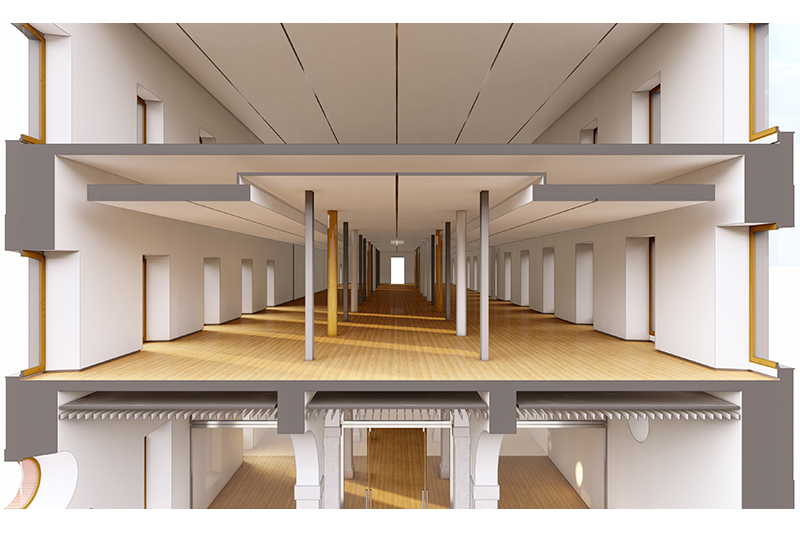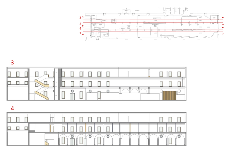 The original construction elements, which must be restored, are: the lower part of the walls up to the first floor and the system of granite pillars that runs through the ground floor, as well as the arches who connect them.