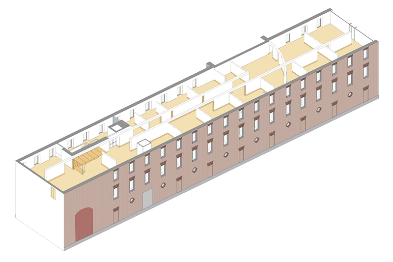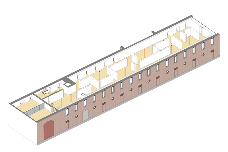The design criteria are: light, reversible construction proposals with a strong unitary image in terms of formal and material proposal, trying not to alter the general typological perception.