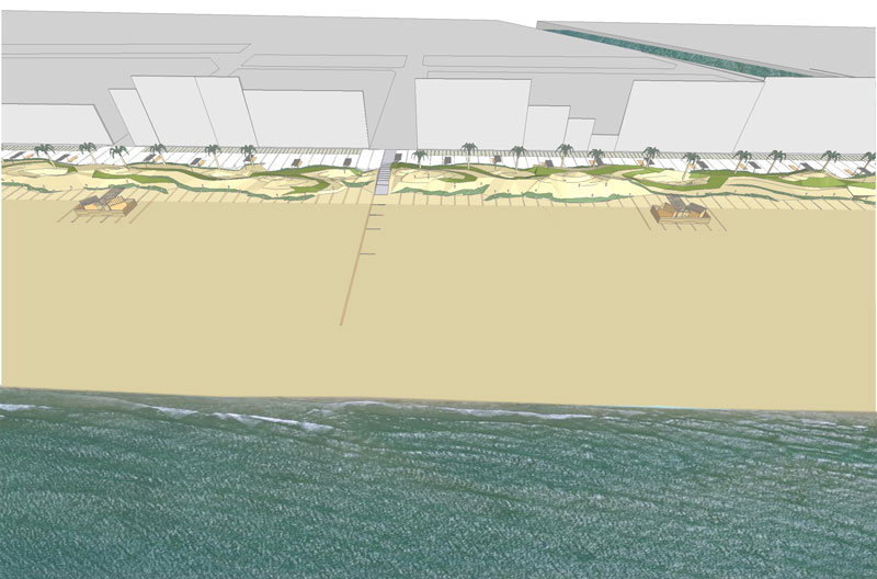 The project is a service platform that includes an area of terraces and a new promenade that incorporates elements of urban design and shade spaces, articulating the existing vegetation (palm trees) with a dune.