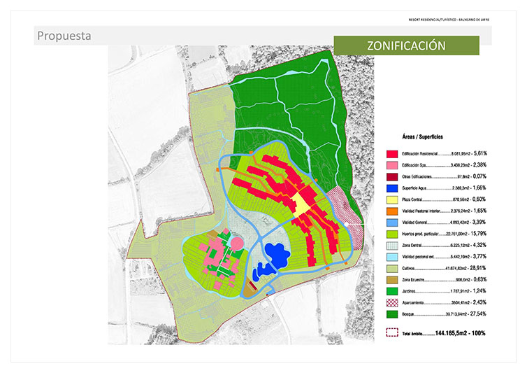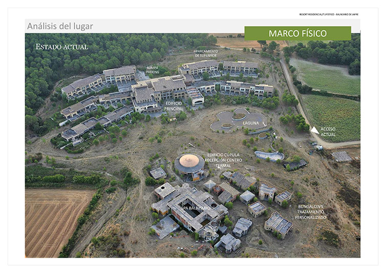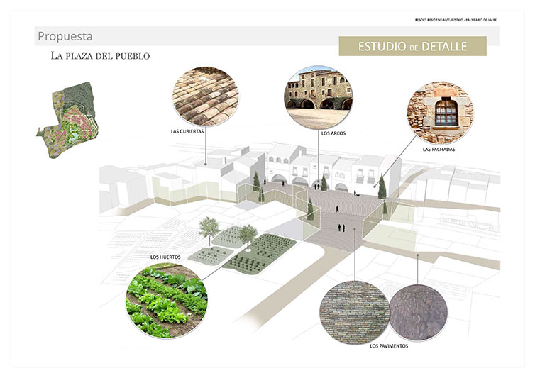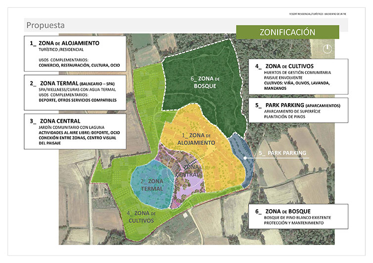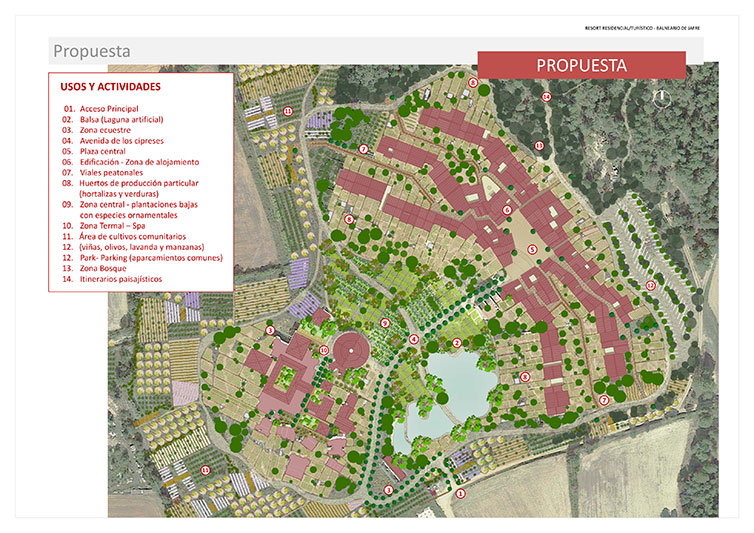 Proponemos transformar el balneario en un resort residencial/turístico con una visión sostenible y ecoeficiente y con un aprovechamiento activo del paisaje (huertos, viñas y jardines como partes de un estilo de vida). Para incrementar su atractivo, proponemos además un paquete de servicios y amenidades aprovechando los espacios libres del sector y algunos de los equipamientos previstos en el proyecto inicial.