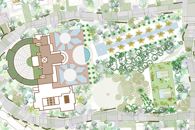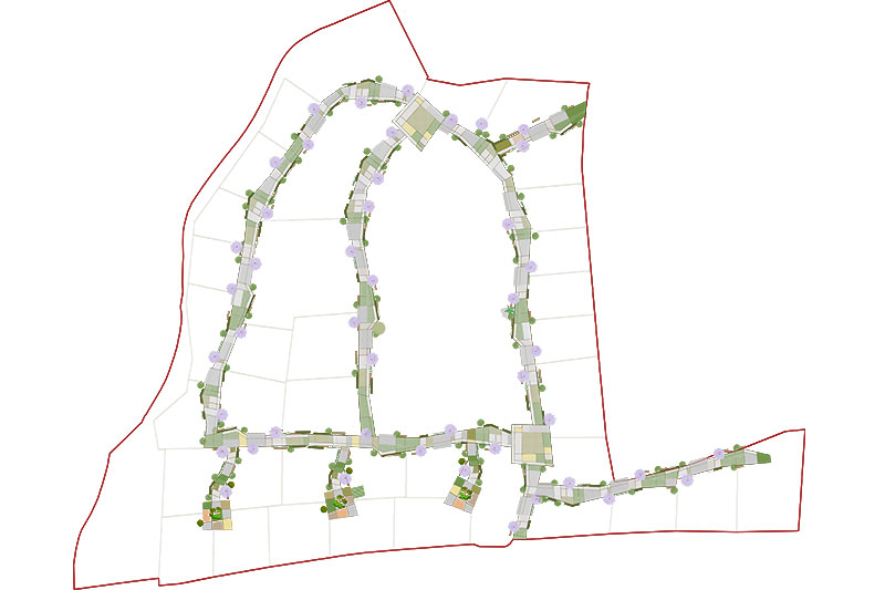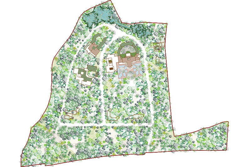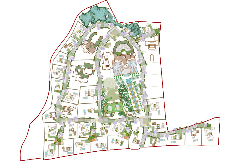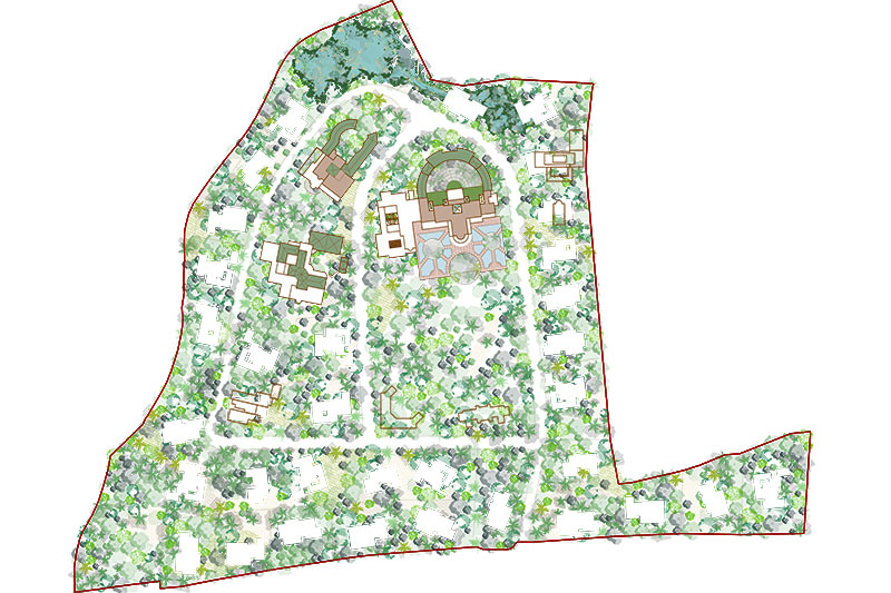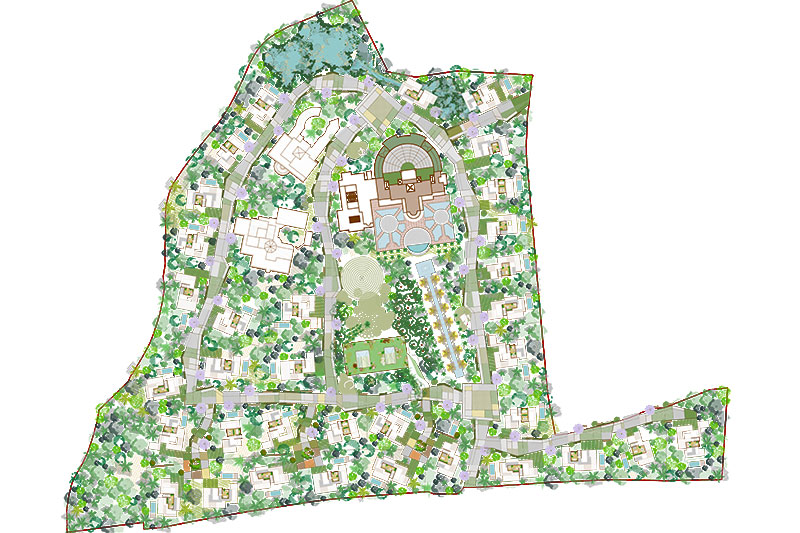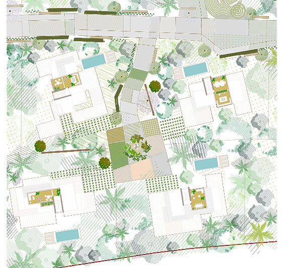 Imaginamos un jardín diseñado al milímetro, como si fuera un proyecto de interiorismo, por arquitectos especializados en decoración, Al mismo tiempo, como contrapunto, las casas que encontramos en medio del jardín se diseñan con criterios de paisajismo, por paisajistas. Imaginamos un proyecto al revés, en el que interior y exterior se compenetran y las parcelas no se desarrollan por separado de manera independiente, sino de manera coherente y fluida en el gran jardín.