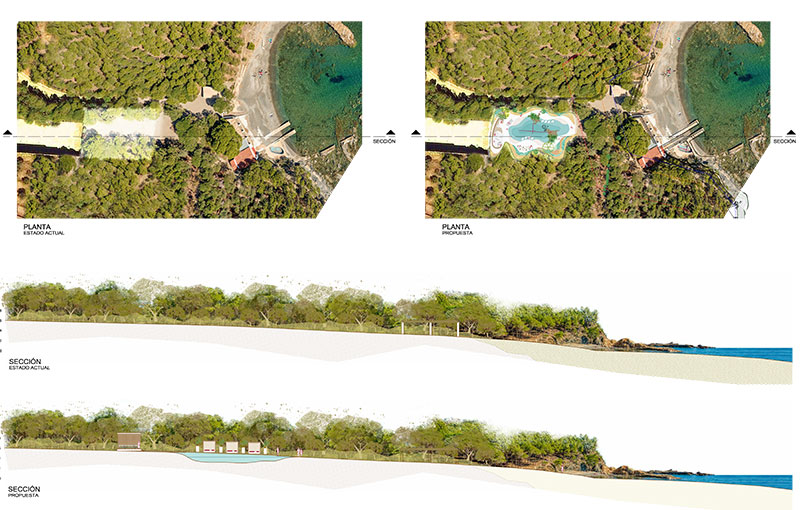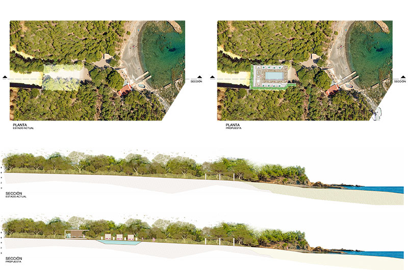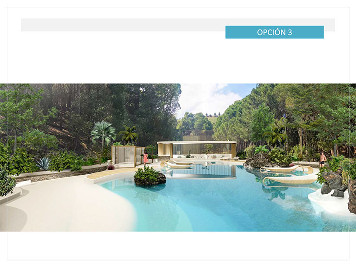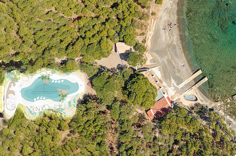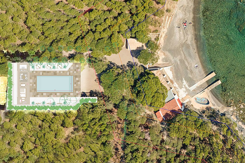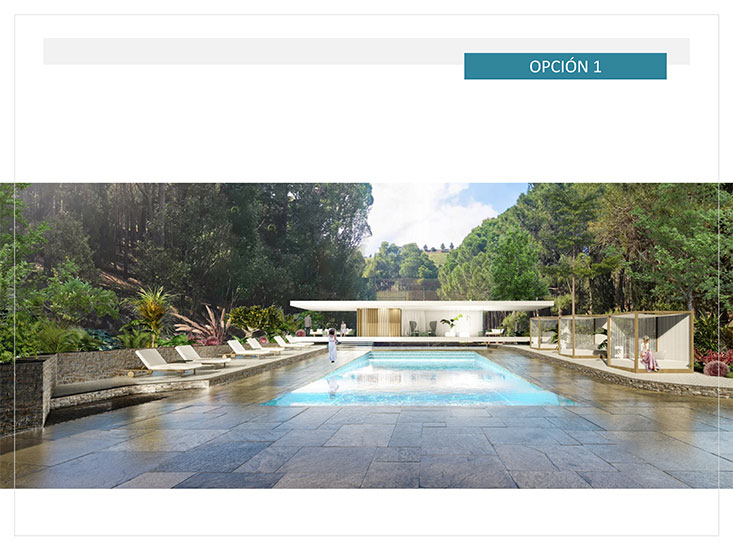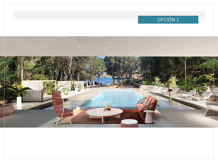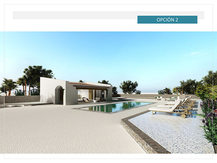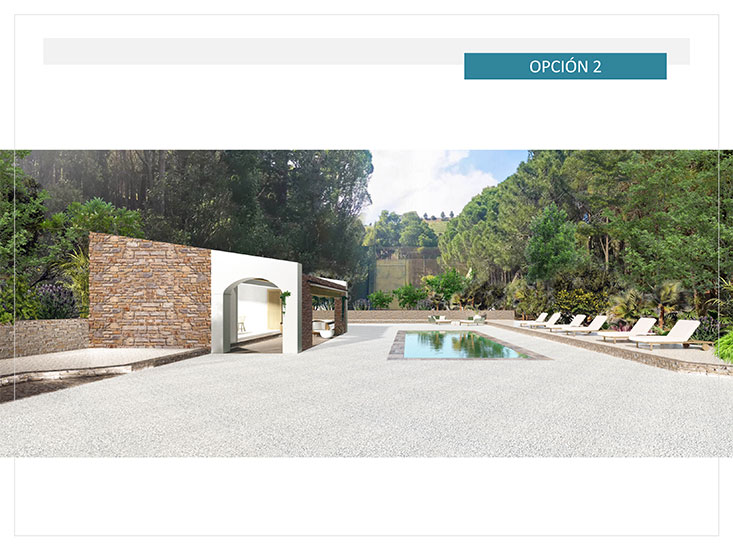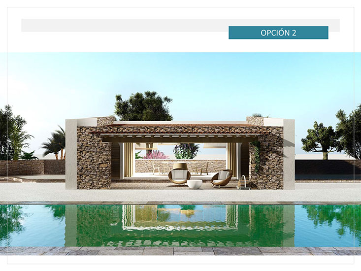 1. La piscina de ocio, un concepto clásico; Diseño clásico y minimalista, inspirado por las piscinas de los palacios y cortijos del mediterráneo. Muros de piedra en seco, fundiéndose con el paisaje natural de la pineda, nos separan del ámbito de la pista de pádel y definen un espacio contenido, sosegado, depurado y majestuoso,