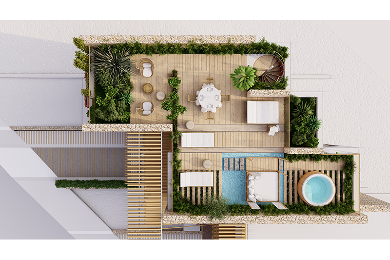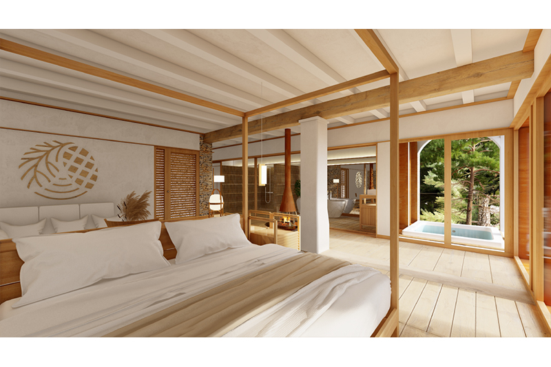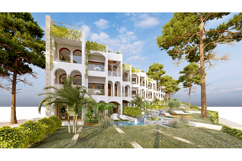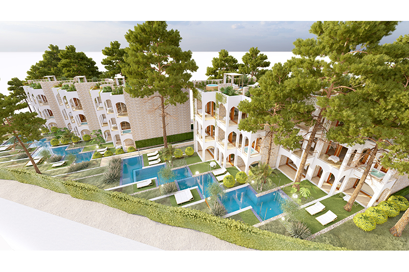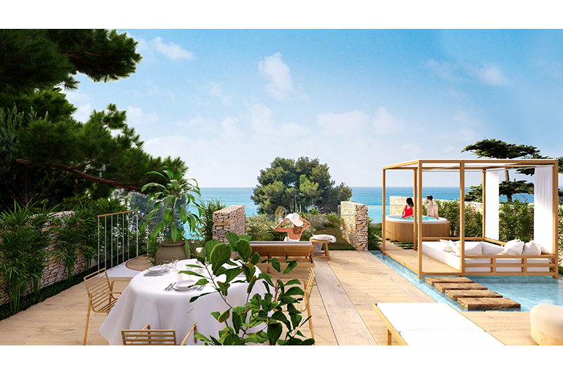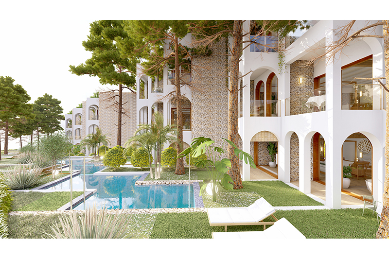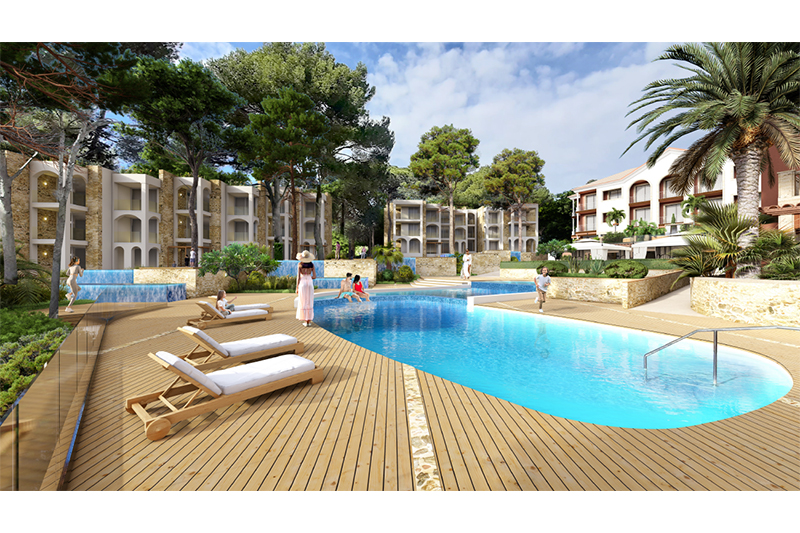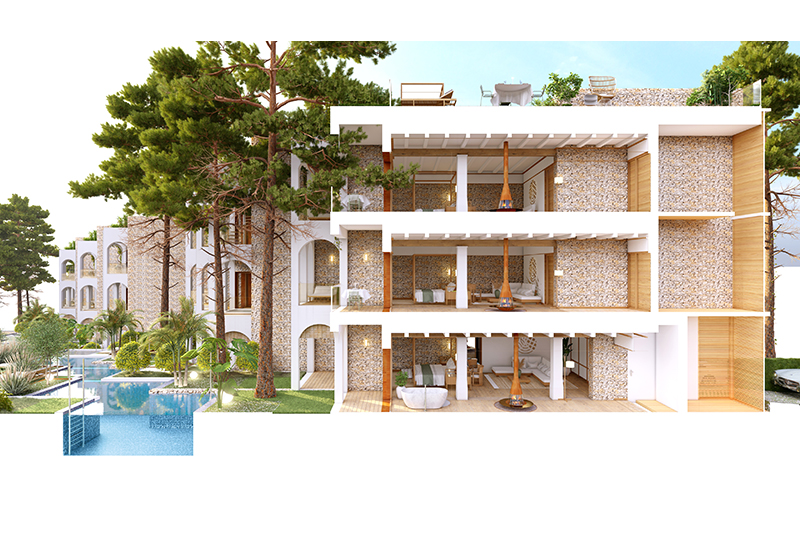 El proyecto consiste en la ampliación del hotel Cala del Pi en 15 habitaciones tipo suite, con terrazas y pequeñas piscinas de uso privado.